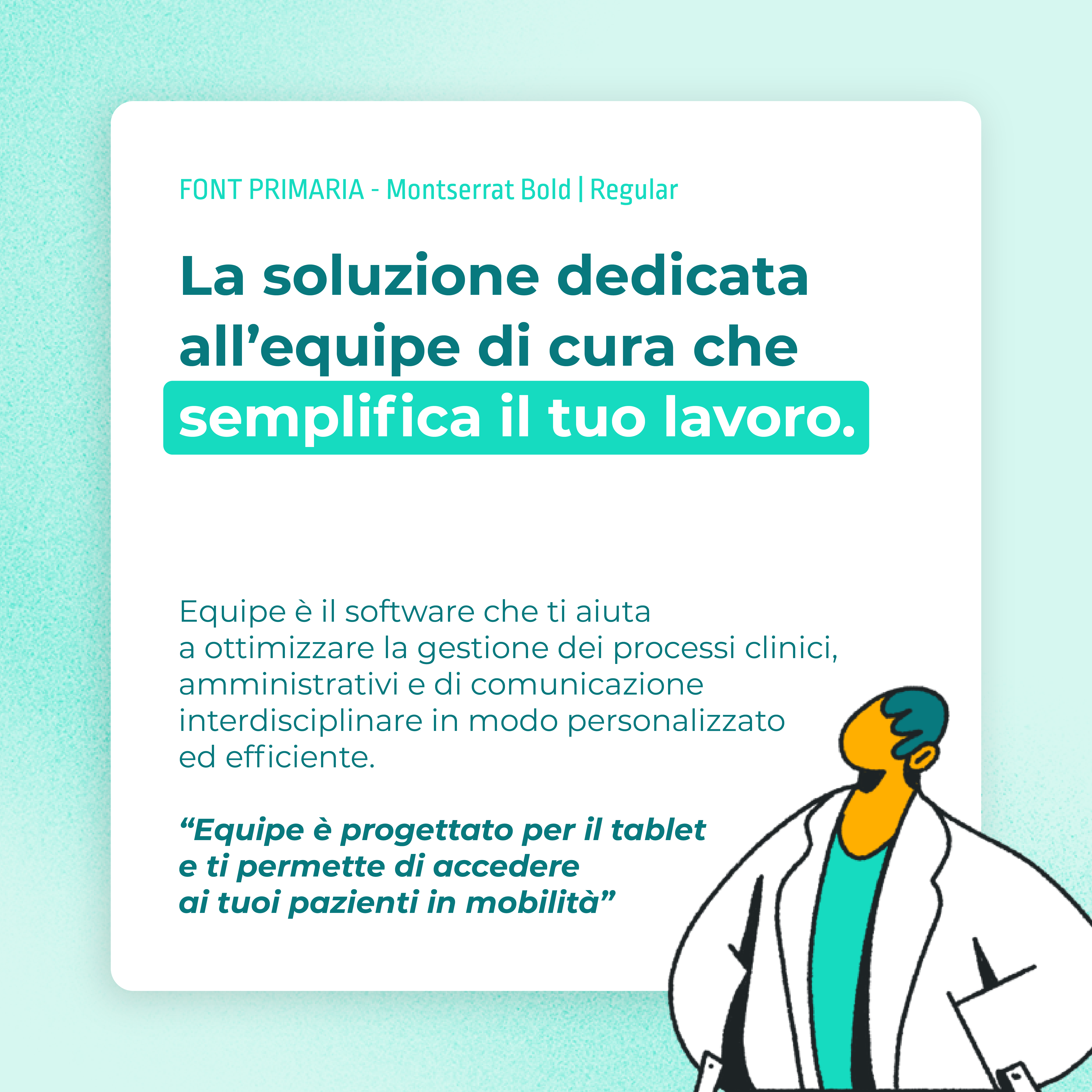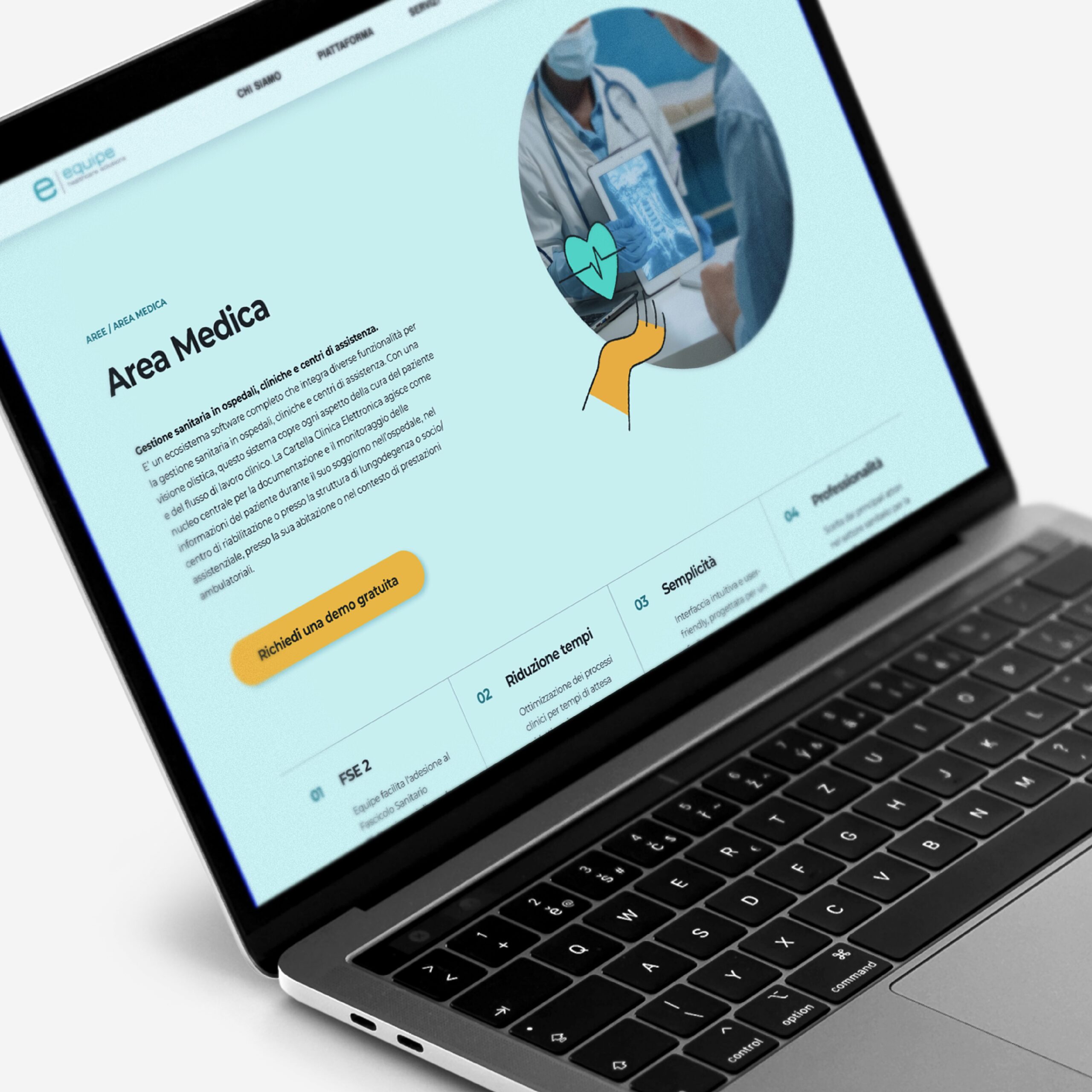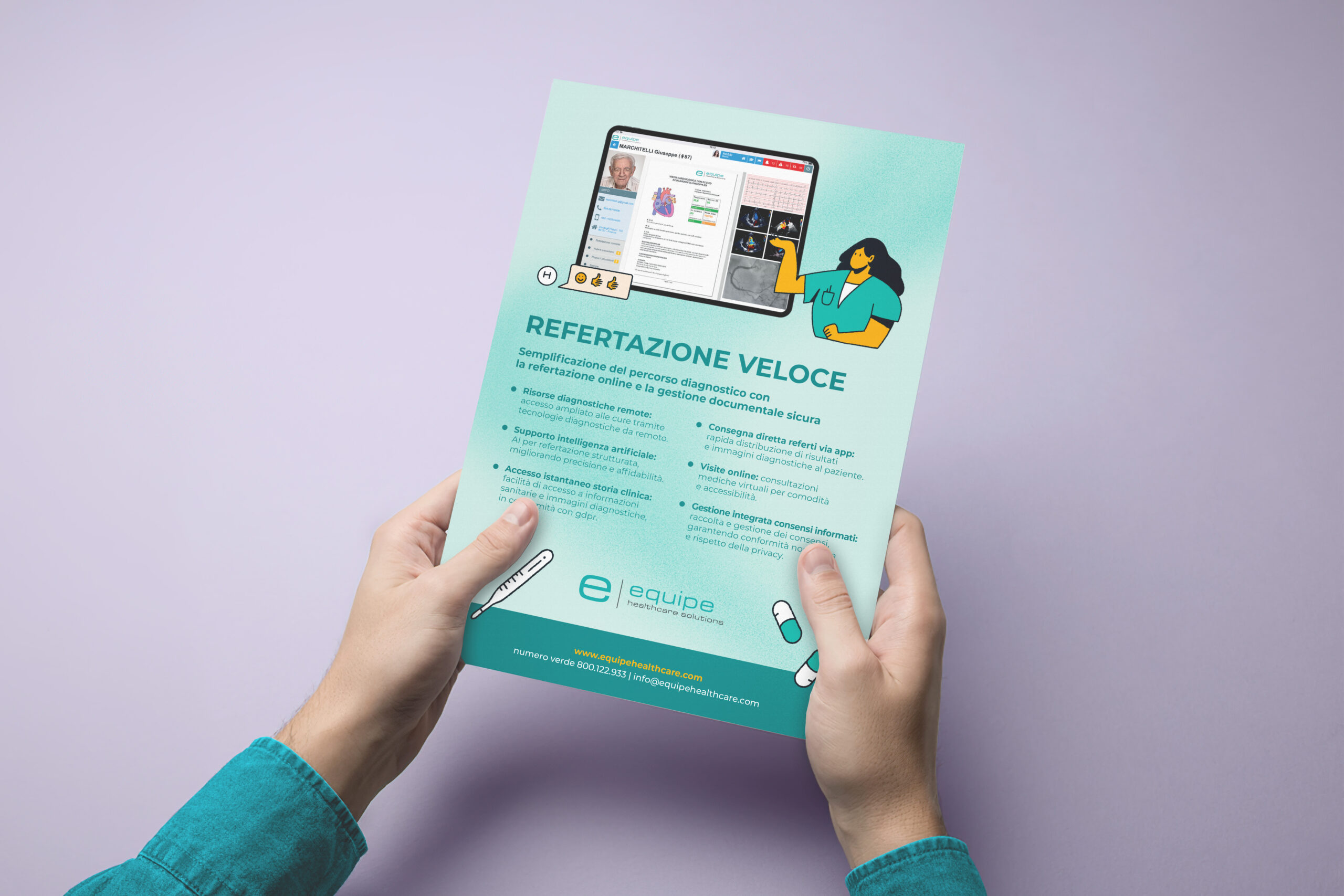 Partendo dal logo esistente di Equipe, il nuovo Look&Feel si distingue per un’estetica minimal e per una palette di colori tenui e rassicuranti, in linea con il mondo medicale. Lo stile illustrativo, semplice ma ricco di dettagli, favorisce l’immedesimazione e l’empatia dell’utente con i personaggi presenti nelle diverse pagine del sito. Nelle sezioni più tecniche, le informazioni sono supportate da stilizzazioni vettoriali della piattaforma, utili a rendere più immediata la comprensione dei contenuti.