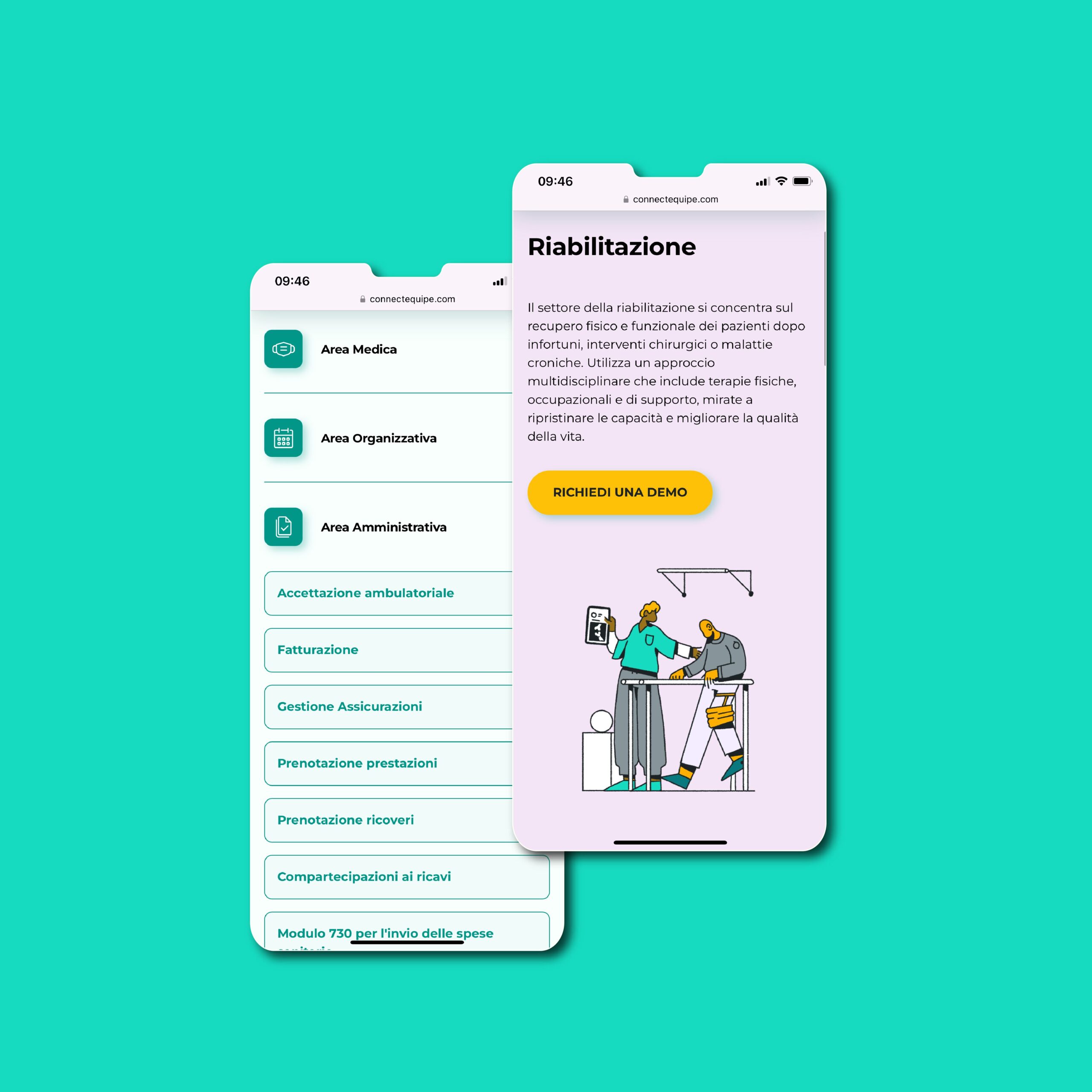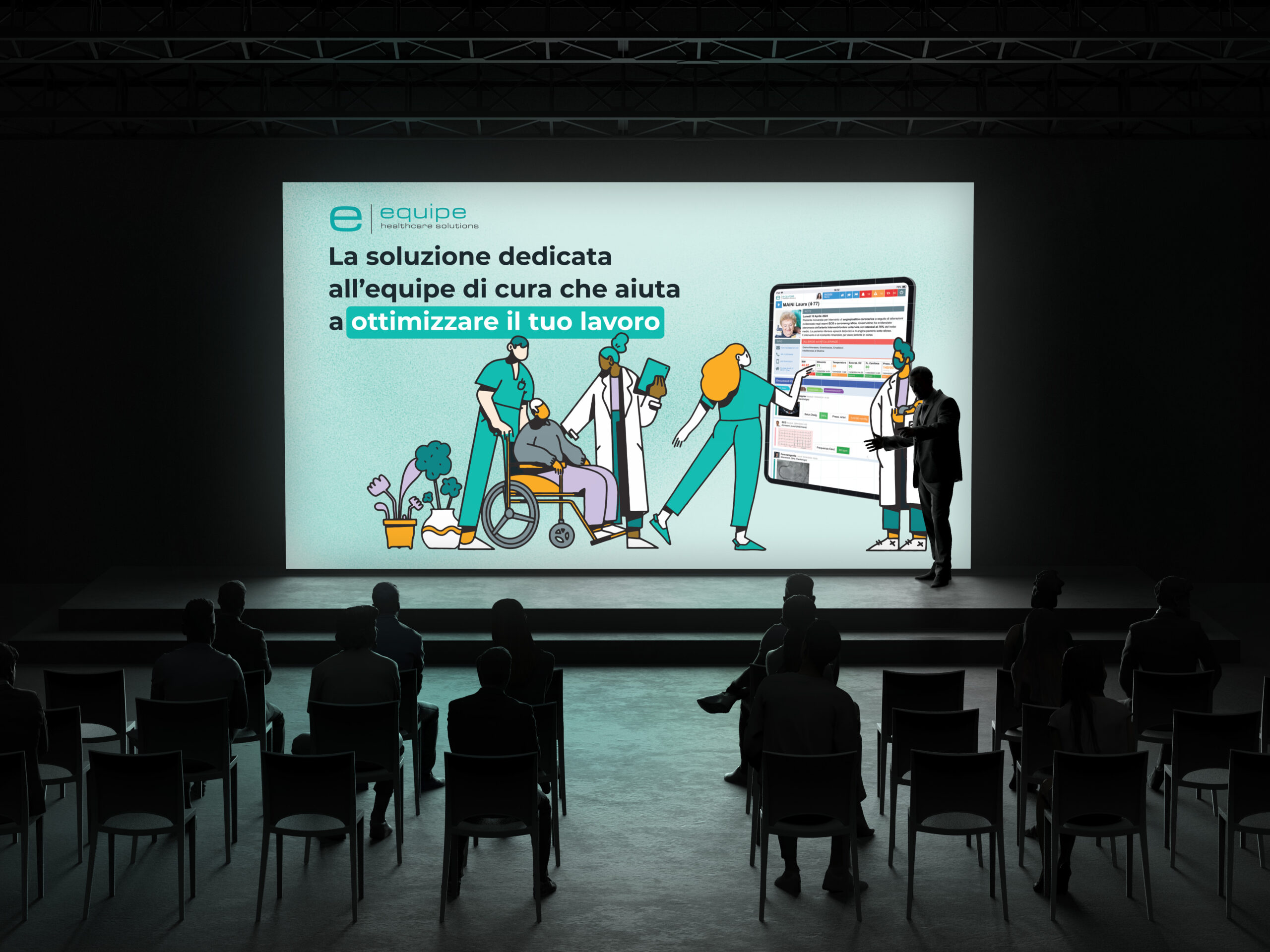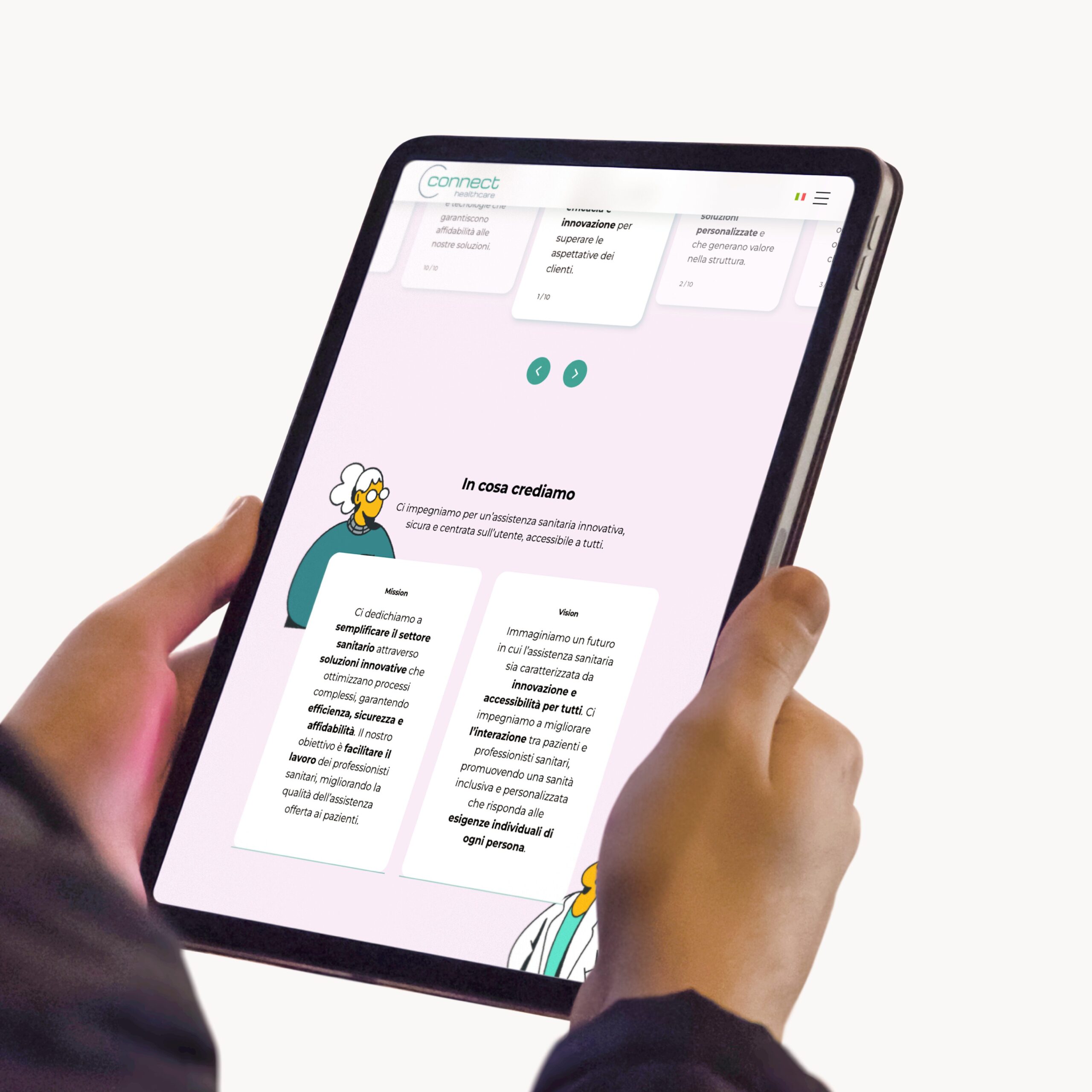 Partendo dal logo esistente di Equipe, il nuovo Look&Feel si distingue per un’estetica minimal e per una palette di colori tenui e rassicuranti, in linea con il mondo medicale. Lo stile illustrativo, semplice ma ricco di dettagli, favorisce l’immedesimazione e l’empatia dell’utente con i personaggi presenti nelle diverse pagine del sito. Nelle sezioni più tecniche, le informazioni sono supportate da stilizzazioni vettoriali della piattaforma, utili a rendere più immediata la comprensione dei contenuti.